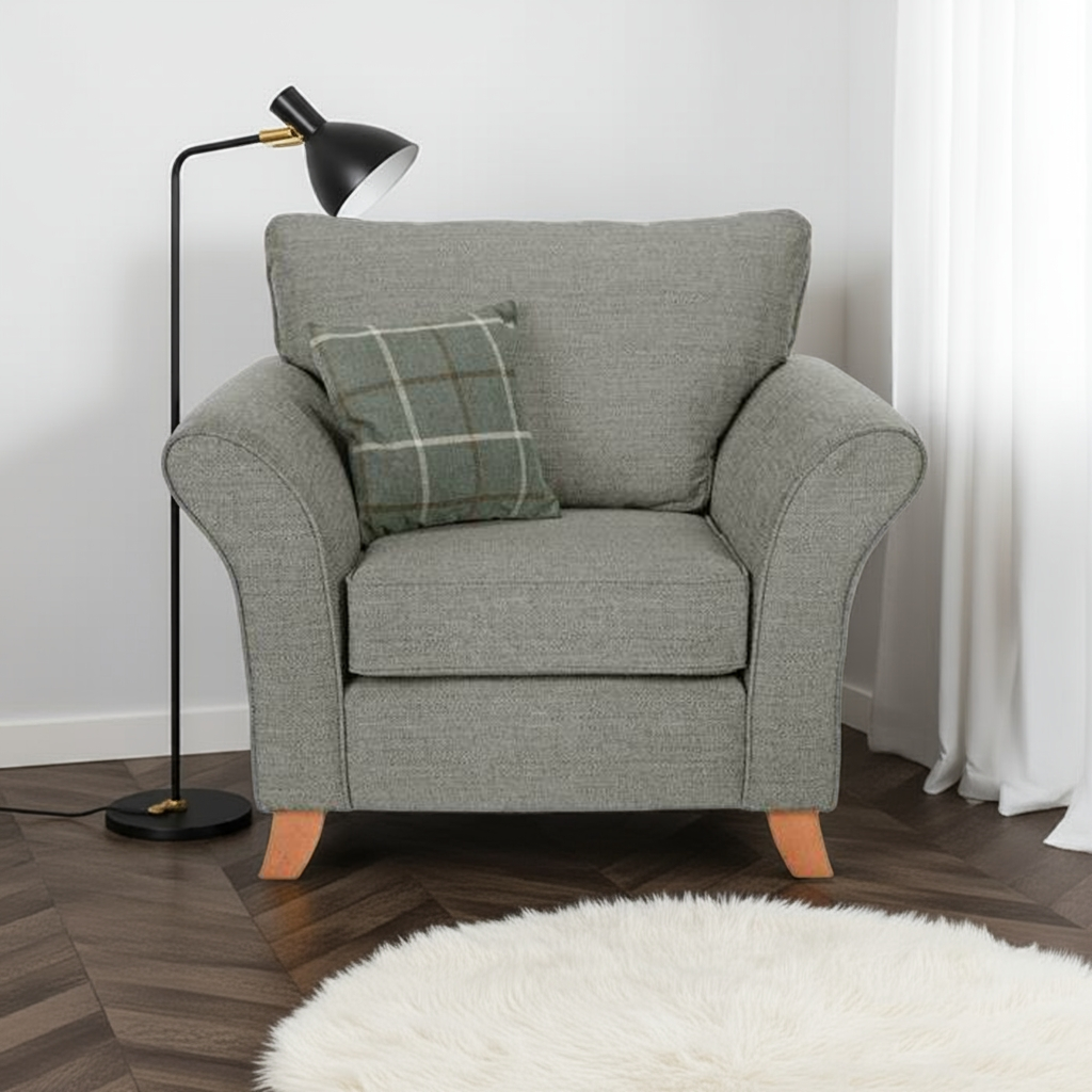 With classic country style our Jasper chair will add a little rustic charm to your living space. In an elegant grey fabric, it would make it a great stand-alone piece or a complementary companion to the Jasper sofa collection. The striking curved natural oak legs of this chair, complete the look.